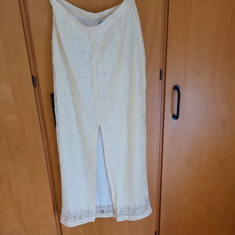 Nederdel er 70 cm i taljen og 50 lang med indlæg og inderfoer. IKKE STRÆK. vil sige det svare til en lille medium både foroven og for neden. Ca str. 38. Et sæt det er mega smukt og der ikke var lavet så mange af.