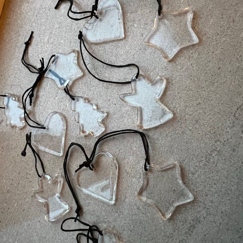 Forskellige ophæng i hvidt porcelæn, klart glas og metal (2 størrelser), med former som hjerte, stjerne, engel, julekugle og juletræ.