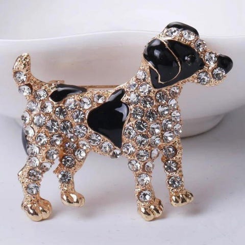 Skør, men HELT SKØN BROCHE af en hund med en fugl siddende på ryggen. Materialet er mørkt metal, men helt dækket af emalje i skøre/skønne farver. Brochen er 5x6 cm og den er helt ny
