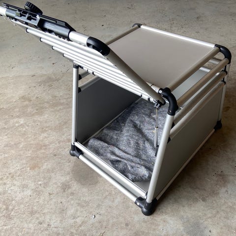 Transportbur i aluminium og træ med metalgitre. Mål top: L.48cm B.50 cm. Mål bund: L.83 cm. B.50 cm. Højde 69 cm.