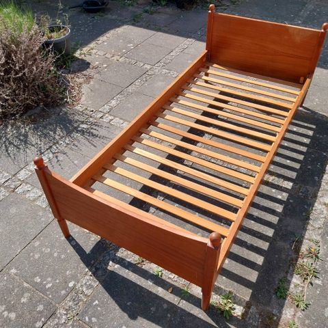 Let og enkel svensk seng i klassisk design fra 1960erne. God madras ( 80×200 cm) fra Jysk medfølger.