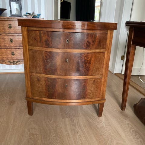 Den er aldrig blevet restaureret, fordi jeg kan lide, at mine møbler ældes med mig. Billedet viser den centrale dør uden den monterede. Døren er dog inkluderet, så kommoden har i alt fire centrale døre.