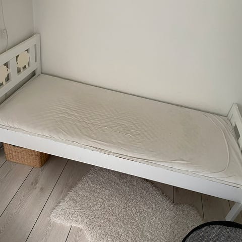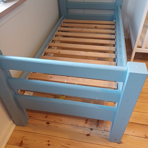 Hjemmebygget børneseng med madras, lameller, ramme og tre kasser fra Trævarefabrikkens lagersalg. Er i god stand. Der er kun en plet på madrassen, som kan vaskes væk. Måler 80x170x13