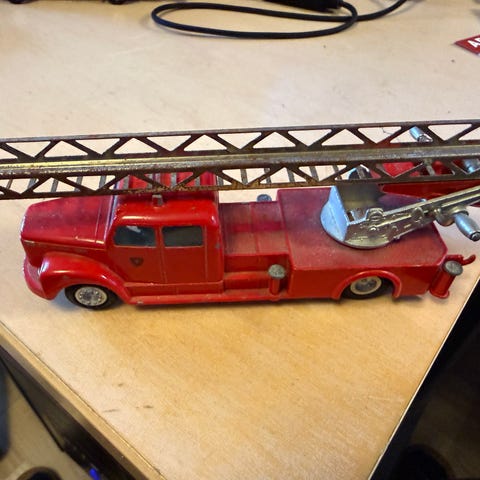 Flot stand på lastbilen. Dog er snor sprungen til at rulle stigen ud. Æsken er ikke i god stand. Folie er gået løs