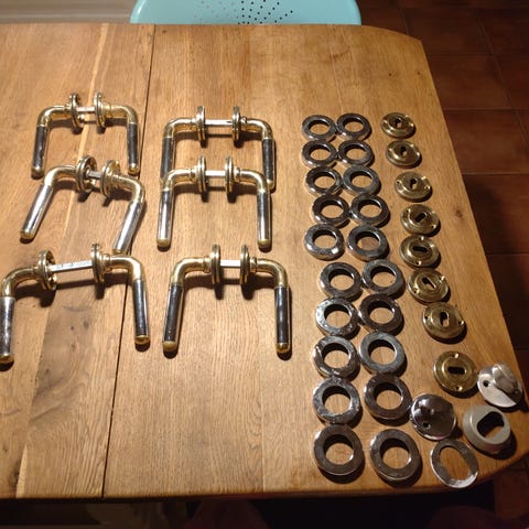 Jeg sælger 5 sæt dørgreb som har været sat op i et par uger og derefter pillet ned da vi valgte en anden model til vores døre. Grebene er: