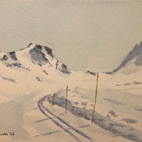 Signeret akvarelmaleri, der forestiller et vinterlandskab med sne og bjerge. Maleriet viser en vej markeret med pæle og en solnedgang eller solopgang i baggrunden. Farvetonerne er domineret af hvide, grå og orange nuancer.