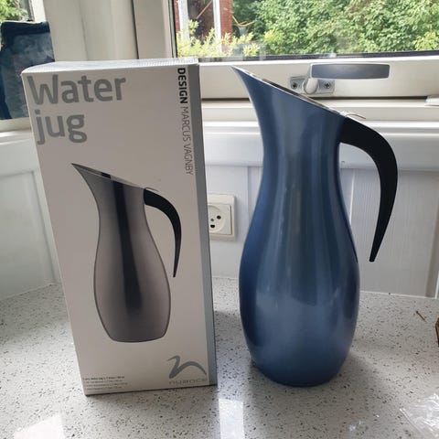 2 Stk. Nuance vandkander fremstillet af kvalitets 18/8 stål, og med et flot gråt overflade sælges for 250,00 kr. pr. stk. De har en kapacitet på 1,7 L, er 30 cm høje og forsynet med et aftageligt isfilter så isterninger, lime osv. ikke kommer med ud når man skænker.