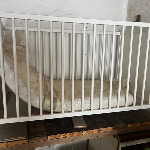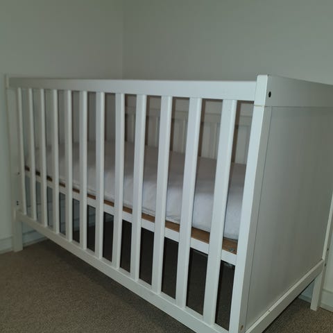 Har denne tremme seng med madras som jeg godt vil af med. Den lille er blevet for stor til den så nu skal den videre. Den er rigtig fin.