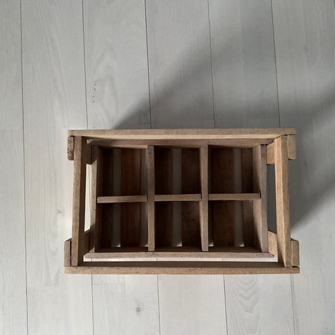 Trækasse inddelt til 6 opretstående flasker. På 4 hjørner sidder blødt metal. Tekst på kassen