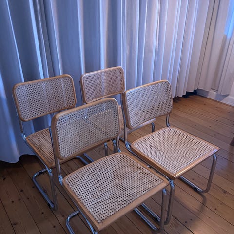 To af stolener er i virkelig god stand, med normale brugsspor, tredje stol er begyndt at være en smule løs i en af hæftningerne, men noget lidt lim burde løse. Fjerde stol har to huller i flettet, derfor fåes gratis med. Se billeder, hvor der er billeder af det beskrevne slid.