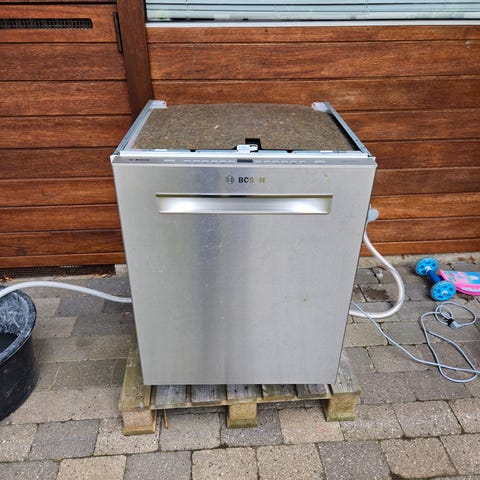 Opvaskemaskinen er Bosch SMV68MD02E/74 (fra 2020, men mangler kvittering) - meget stille, rummelig, digtalt display vist ned på gulv, fungerer super fint. Er til indbygning bag låge.