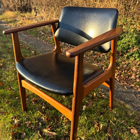 Smuk dansk design stol i teak og mørkegråt uld, Danish Furniture Makers ( mener den er af Arne Vodder, evt. 62A). Sælges meget billigt da den har normale brugstegn med fordel kan omstoppes (tape under sæddet er for ikke at lække mere savsmuld, man kan sagtens sidde fint i den uden - det giver dog ikke mening for mig at lukke den ordentligt før evt. fyldning).