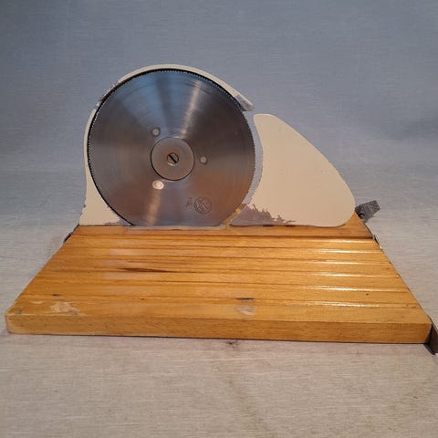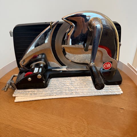 Eva brødskærer i brun farve. Designet til manuel skæring af brød med håndsving og skæreskive. Fremstillet i holdbare materialer med en stabil base, der kan fastgøres til bordpladen for sikker brug. Maskinen er rigtig fin og total rengjort, smurt op og klar til brug, kan sendes med DAO.
