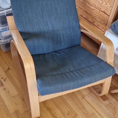 Fin gyngestol. Sælges pga pladsmangel. Inkl fodstøtte. Mørkebrun - næsten sort træ og stof. Stoffet kan tages af og vaskes.
