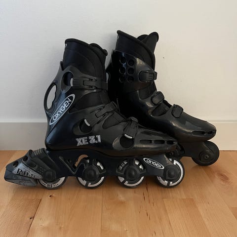 Inliners, OXYGEN XE 1.1 INCL. TASKE, str. 42-43, Super velholdte inliners / rulleskøjter /rollerblades sælges sammen med en tilhørende skuldertaske. Det hele er kun brugt ganske få gange mrk OXYGEN XE 1.1 herefter har de bare stået opbevaret i skabet. Skøjterne sælges med tilhørende skuldertaske til opbevaring og transport af in-Line skøjterne mm. Str. er 42-43 herre svarende til 27,5 cm