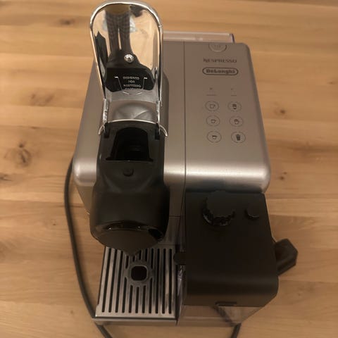 De'Longhi Nespresso kaffemaskine i hvid farve. Kaffemaskinen har et kompakt design med en aftagelig vandtank og drypbakke. Velegnet til brug med Nespresso-kapsler til tilberedning af espresso og andre kaffedrikke. Lækker, let betjent kaffemaskine med de rigtige 19 bars tryk. Til Nespressokapsler. Sælges grundet opgradering til større maskine. Fungerer fuldstændig upåklageligt. Set på tilbud i Magasin til kr. 998,-