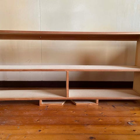 Reol i træ med hylder og opbevaringsrum