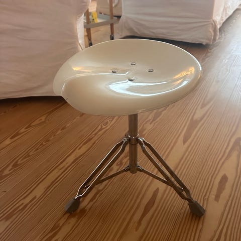 &Tradition højdejusterbar taburet med hvidt sæde og metalstel. Taburetten har en rund, formet siddeplade i hvidt materiale og et justerbart metalstel med tre ben og gummifødder. Designet til brug som siddeplads ved bord eller arbejdsstation.
