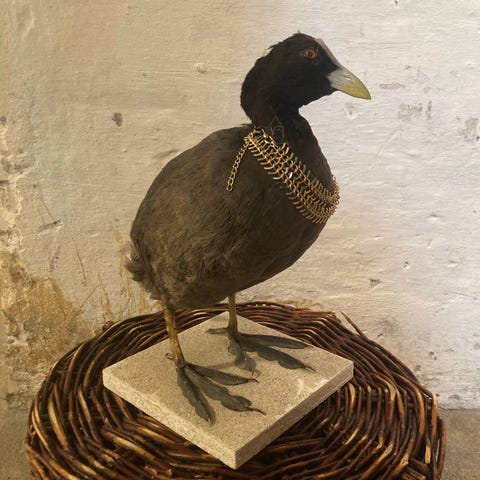 Jeg sælger denne udstoppede blishøne. Den har stået i glasskab siden jeg fik den og alle fjer sidder ordentligt fast.
