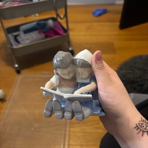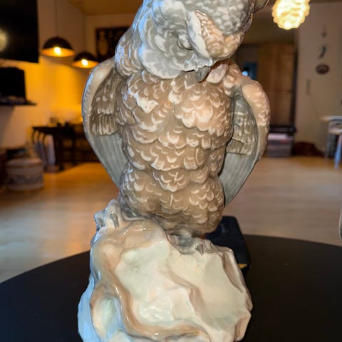 Royal Copenhagen ugle figur fremstillet i porcelæn med detaljeret malet overflade i brune nuancer. Figuren er designet som en ugle siddende på en firkantet base.