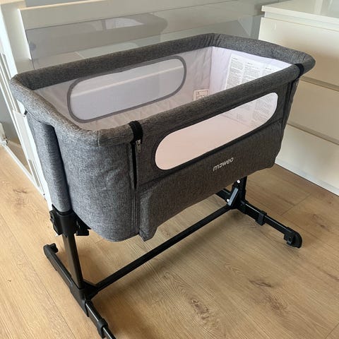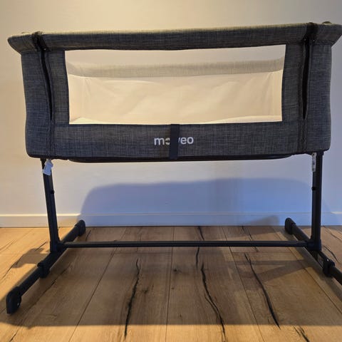 Moweo bedside crib designet til børn. Sengen har et stel i sort og sider beklædt med gråt stof samt netvinduer for ventilation og overblik. Egnet til placering ved siden af voksen seng for nem adgang til barnet.