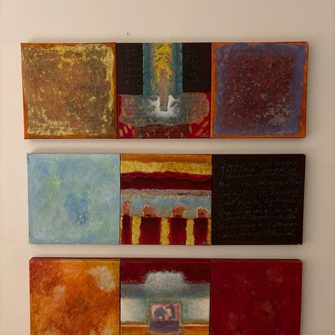 Sæt bestående af 2 håndlavede dekorative vægkunstværker af Susse Volander med husmotiv kaldet "Naboerne". Værkerne er malet i blå og hvide nuancer med glas-detaljer i brun og sølv. Måler hver 20 x 9 x 4,5 cm (HxBxD) Sælges samlet