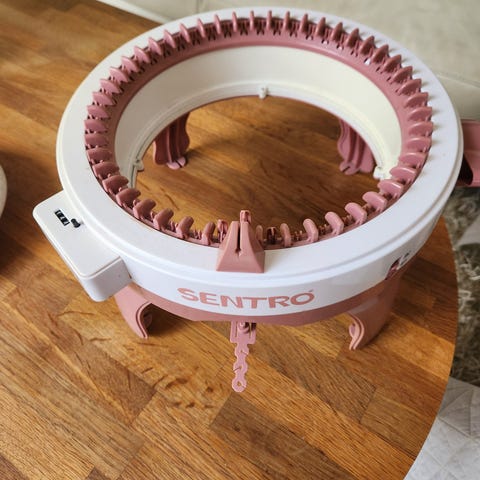 Strikkemølle til strikning med drejehåndtag. Designet til at hjælpe med at strikke jævne og ensartede stykker. Indeholder instruktioner til brug og vedligeholdelse.