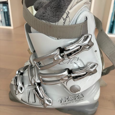 Tecnica Mach1 115 ski støvler i hvid farve, størrelse 45. Støvlerne har flere spænder til justering og en robust konstruktion designet til skiløb.
