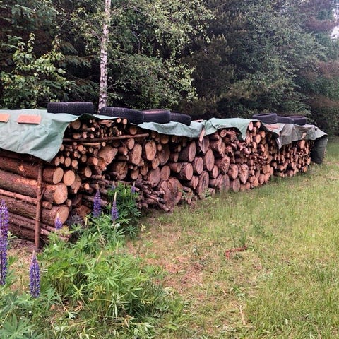 Brænde i 60-70 cm længde, grantræ, fyrtræ, elmetræ, lidt birk og andet løvtræ fra en sommerhusgrund. Stakken er ca 6x3 m og 1,3 m høj. Giv et bud.
