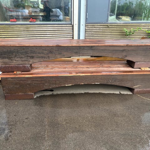 To træbænke i hvid/knækket, med træ-lameller i sædet og ryg med krydsdetalje - virkelig fine.