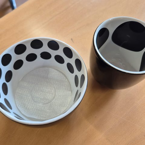 Materiale: Skålene er lavet af feltspatporcelæn. Lys grøn og hvid.