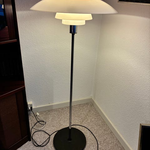 Louis Poulsen PH gulvlampe designet af Poul Henningsen. Lampen har en hvid skærm og en metalfod. Den er velegnet til brug i stuer eller andre opholdsrum.