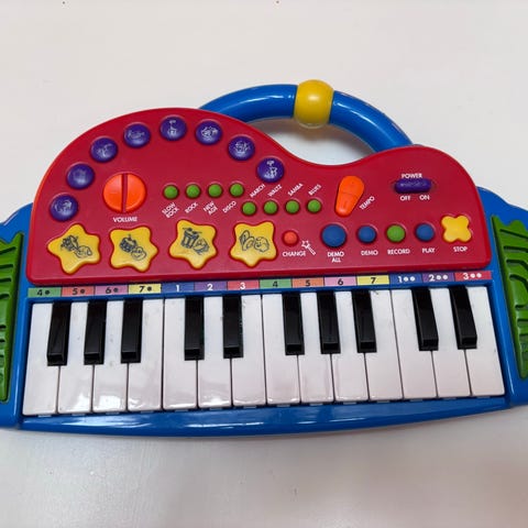 Legetøjskeyboard med 32 tangenter i rød og sort farve. Fremstillet af plastikmateriale. Velegnet til børn til leg og musikalsk udforskning.