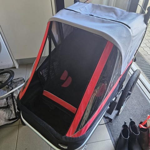 Af- og påmontering foregår let og hurtigt. Anhængeren rummer plads til to børn på det polstrede sæde.
