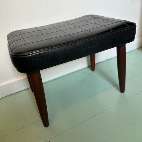 Trekantet retro skammel med brun læder, sidelængde: 49,5 x H: 39 - 42,5 cm