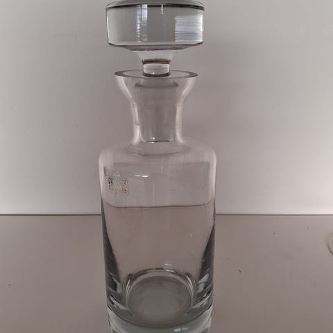 Produkten er en dekorativ karaffel i klart glas med slebet mønster. Den har en rund bund og en slank hals, samt en stilfuld proppede øverst. Der er et vedhæng med teksten "SHERRY", prydet med roser.,Afhentes i:,Røde Kors Glostrup (161),Bemærk at mail, chat og beskeder ikke besvares, og varen skal købes på knappen "Gå til varen"