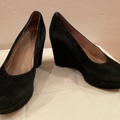 Sorte spumps i størrelse 38 lavet af ruskind. De er fra 1992. Fejler intet.