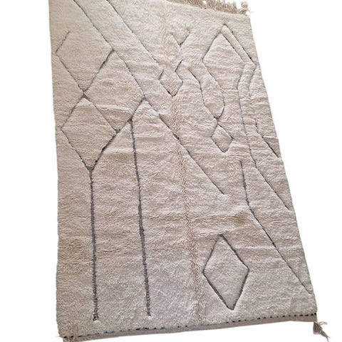 Fortryl dit hjem med dette berber-tæppe Beni Ouarain écru ensfarvet, prydet med store romber, der subtilt er indvevet i vævet. Håndlavet i ren uld af en enestående kvalitet, byder tæppet på en uovertruffen blødhed og en fyldig, behagelig tekstur. Tidløst og alsidigt passer det perfekt ind i alle dekorationsstile, uanset om de er moderne, traditionelle eller vintage. Dets generøse størrelse gør det til et ideelt valg for en rummelig stue eller et stort soveværelse. Dette tæppe er meget mere end et dekorativt element: det er et ægte håndværkskunstværk, båret af historie og håndværksmæssig kunnen.