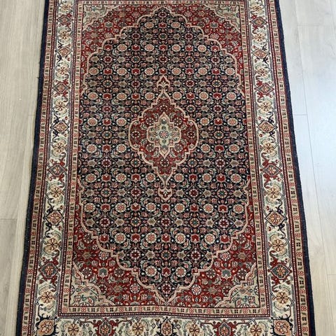 Et håndvævet orientalsk tæppe i Tebriz-design fra Indien, cirka 199 × 125 cm, materiale: uld på bomuld, fremstillet i slutningen af det 20. århundrede, i god stand. Klik på den blå "gå til varen" knap, for at købe eller byde på denne vare. Den samlede pris vil blive vist inden du afgiver dit bud.