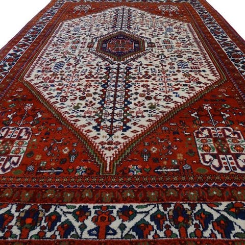 Pelsen er lavet af naturlig uld, knyttet på en bomuldsgrund, hvilket resulterer i en blød, men holdbar struktur. Farvepaletten er rig og harmonisk, med dyb rød, elfenben, bleg blå og salviegrønne nuancer, der forbliver godt bevaret.