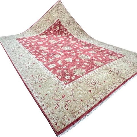 Elegant Royal Ziegler-tæppe, håndknyttet i Pakistan, med et klassisk blomstermønster og en dybrød baggrund samt en blød beige kant.