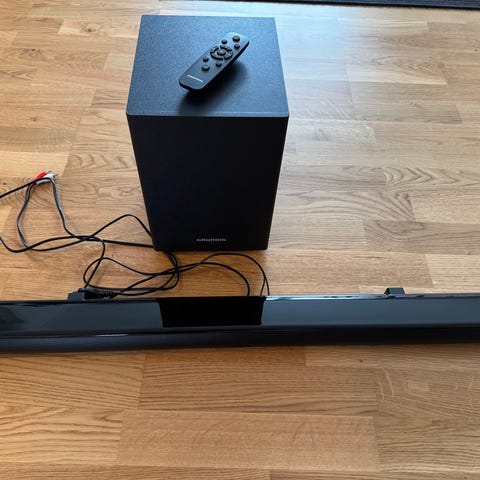 Medfølger: Soundbar, subwoofer og strømkabler.