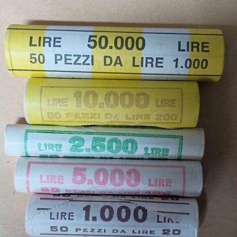 Italien. Lotto di 3 rotolini, 5 Lire 1951, 10 Lire 1998 Spighe Lunghe, 5 Cent...