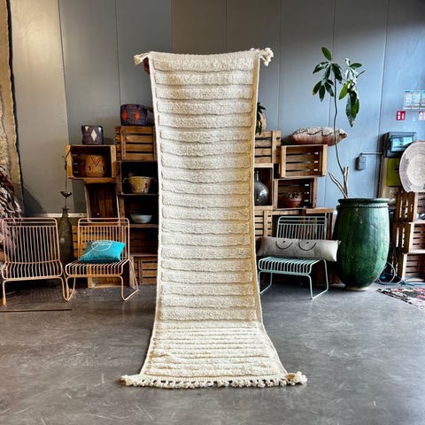 Marokko, 21. århundrede, Modern Runner Moroccan Berber White Wool Rug, håndvævet i Høje Atlas, uld på uld, 370 x 100 cm, ca. 15 kg, i meget god stand og professionelt renset. Klik på den blå "gå til varen" knap, for at købe eller byde på denne vare. Den samlede pris vil blive vist inden du afgiver dit bud.
