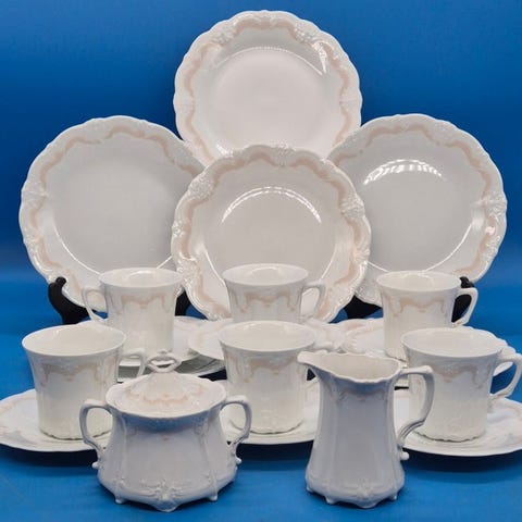 Til salg står et elegant kaffestel fra den traditionsrige porcelænsfabrik Königl. pr. Tettau, grundlagt i 1794. Stellet præsenterer sig i fint hvidt porcelæn med en stilfuld, diskret struktureret kantdekoration i gråt og en fin udført guldkant, som understreger den klassiske linjeføring af dette kvalitetsstel. Former er typiske for fabrikken og forener tidløs elegance med fin bordkultur.