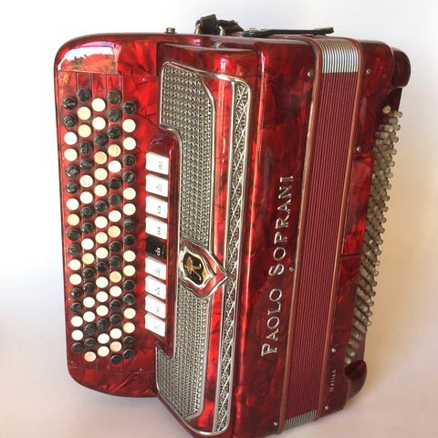 Akkordeon Paolo Soprani, jeg får at vide, det er fra 1950’erne/60’erne, men jeg har ikke kunnet finde referencer. 3 ved diskant, 2 ved bas. 120 basnoter, 41 tangenter. 5 registre i diskant, 2 i bas. Fungerer godt, bør gennemgås for at forbedre lyden, måske ved at udskifte nogle ventiler. Små slidmærker som vist på fotografierne. Stropperne er ikke nye.