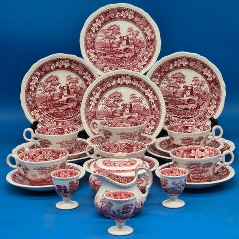 Servicen er udført i rødt transfertryk og viser en detaljeret landskabsscene med tårn, bro og træer.