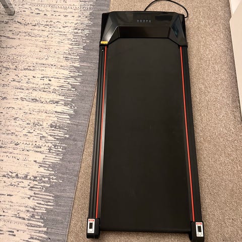 Fint og velfungerende gåbånd. Hastighed op til 6 km/t. Der følger fjernbetjening med, hvor man skruer op og ned for tempo, og hvor man kan se antal skridt.