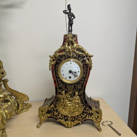Fransk bronze mantelurs med mekanisk værk, 8-dages kørende, halvtime slag på en klokke, afbilledet en galant dame, i god brugt stand, højde 45 cm, bredde 32 cm, dybde 13 cm, vægt 2,5 g, med optræksnøgle. Klik på den blå "gå til varen" knap, for at købe eller byde på denne vare. Den samlede pris vil blive vist inden du afgiver dit bud.