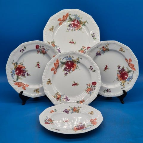 Sættet omfatter flere serveringsfade og skåle i klassisk oktogonal form med højt relieffkant og fin, farvet blomsterdekoration.